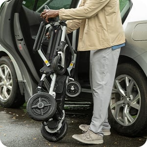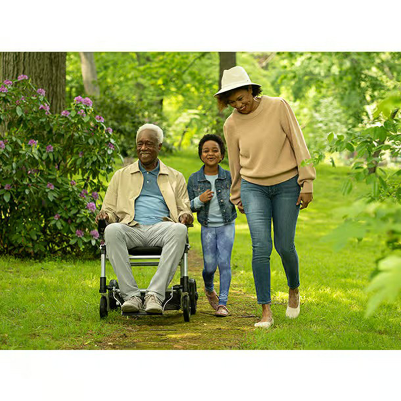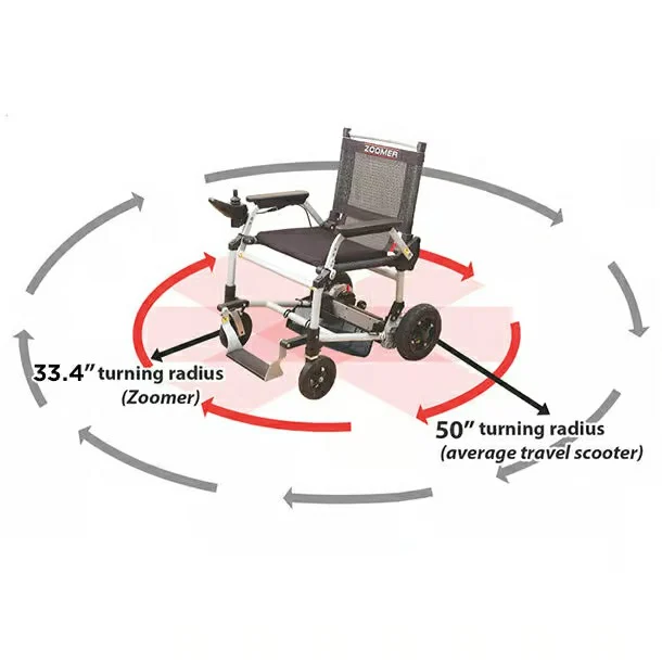 This folding power chair that puts your mobility at your fingertips. With easy one-handed joystick control and extreme portability, Zoomer works indoors and out to help you go almost anywhere your heart desires. Now you can take that “roll” in the park you miss or shop until you drop without slowing down.
